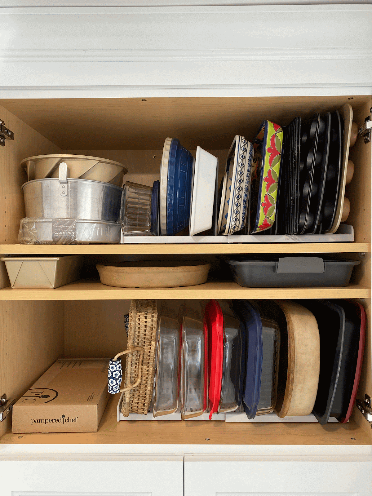 This pan organizer is my go-to for pans, platters, bake ware, and cutting boards! The dividers can be moved around to accommodate the exact size of what you are holding in place. This is a much better option than stacking a pile of glass baking dishes. I frequently use these in the cabinet above the refrigerator.
