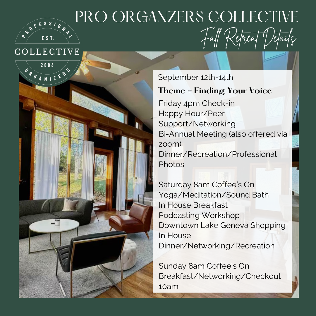 Hello Organizers, Efficiency Consultants, Life Coaches, and Friends who love following their favorite organizing professionals to see what we’re up to! We've made our way into the heat of the summer, and we couldn’t be more excited to share some details about our upcoming Lake Geneva, Wisconsin Retreat - taking place on September 12th-14th, 2025.